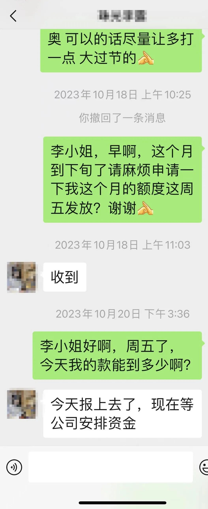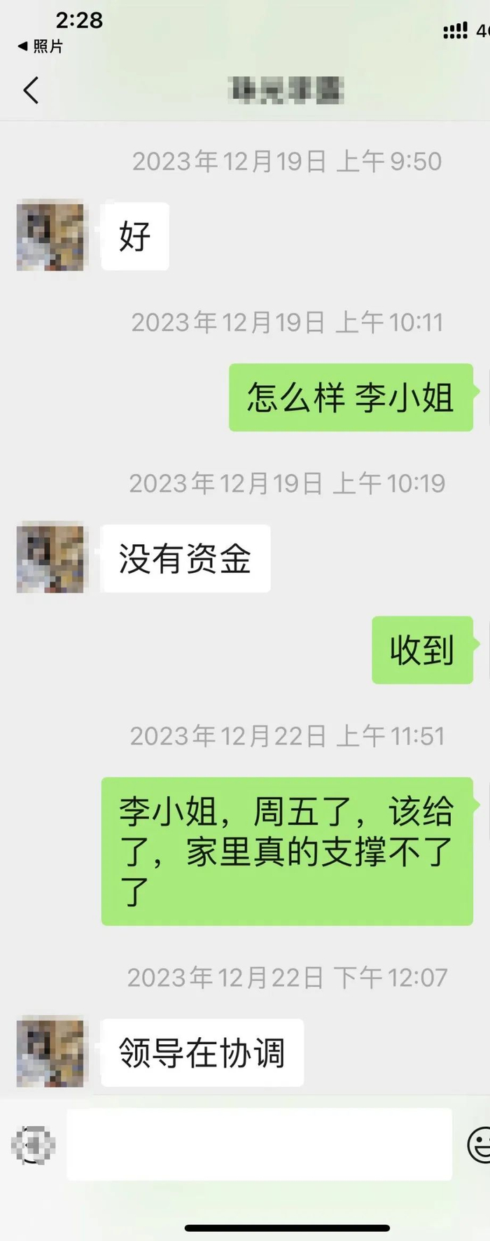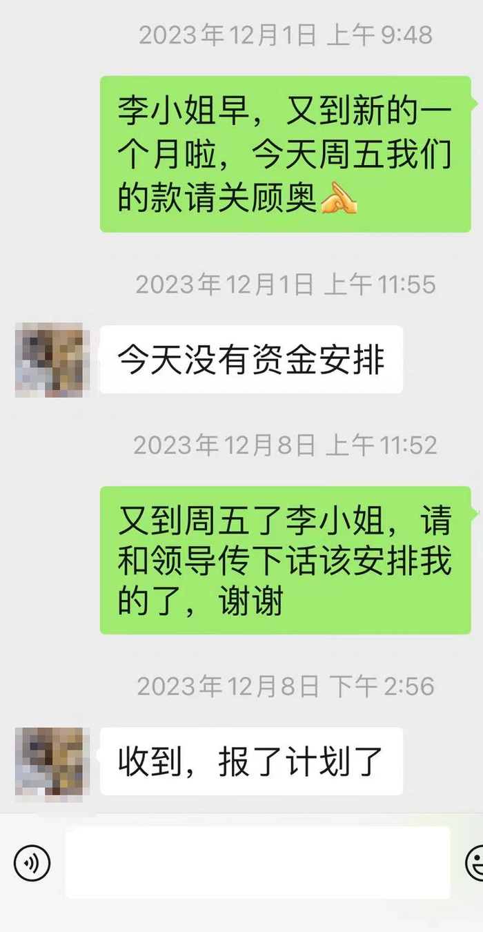 而根据他提供的截图,这位珠光客服负责人李小姐,也是不断回复“没有资金安排”“没有资金”“报了计划了”“领导在协调”等等说辞。