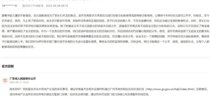 2023年4月,还有业主忧虑小孩上学问题,表示项目不履行承诺,导致孩子无法如期入学。