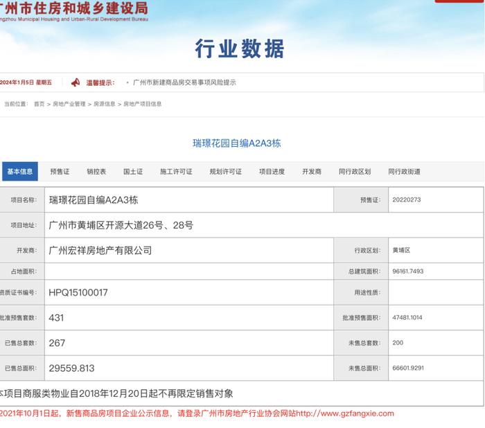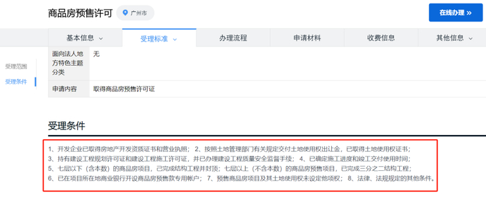 广州住建局官网显示,取得商品房预售证许可的前提条件有八条,其中包括“七层以下(含本数)的商品房项目,己完成结构工程并封顶;七层以上(不含本数)的商品房预售项目,已完成三分之二结构工程”。