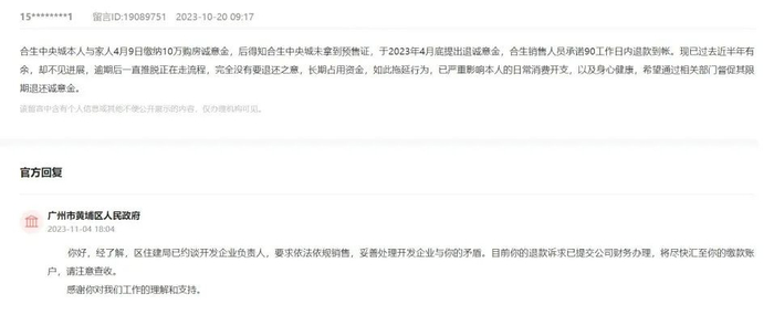 察叔翻了一下,发现黄埔区领导留言板上,许多逾期退款相关的投诉,都与黄埔中央城有关。