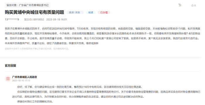 领导留言板也有业主反馈质量问题。