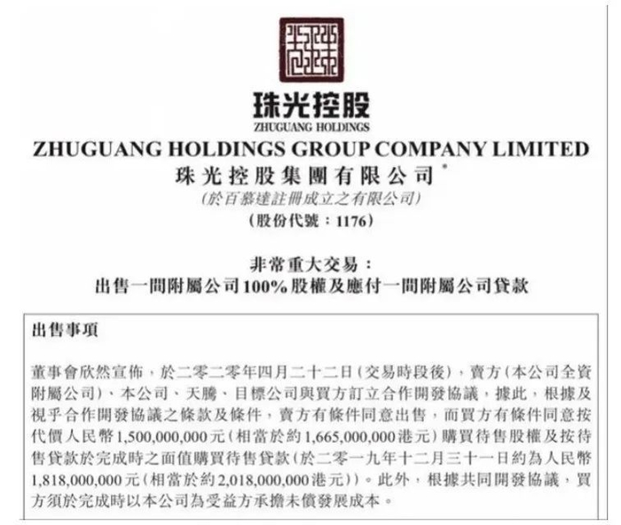 项目一开始是珠光的,2020年4月,珠光控股集团有限公司发布公告称,将出售广州黄埔火村旧改项目全部股权及贷款,总价31.18亿元。