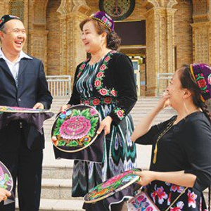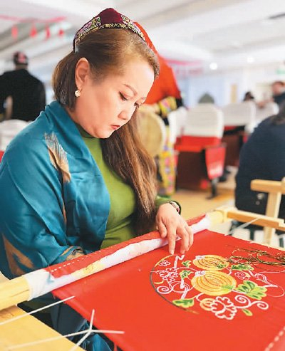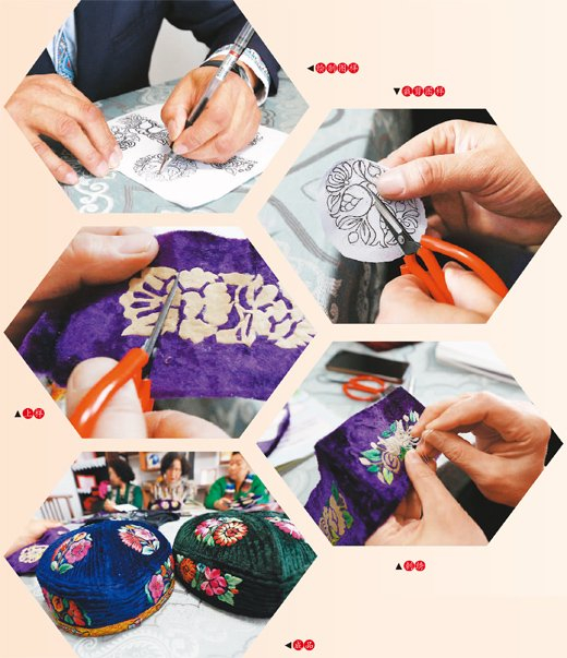 古代丝绸之路必经之地新疆哈密,流传着古老的维吾尔族刺绣工艺。擅长刺绣的维吾尔族妇女,用银针和彩线把自然界中的花卉草木、流水山峦绣制成一幅幅艳丽华美的图案,并巧妙地把它们装点在花帽、衣领、袖口周边,或是枕头、被褥的醒目处,以展示她们穿花纳锦的心灵手巧和丰富的艺术想象。今年50岁的哈密市陶家宫镇乔麦庄孜村村民卡德尔·热合曼,就在有这样传统的家庭长大。从小受到母亲和姐姐的熏陶,卡德尔展现出了非凡的刺绣才华。第一次由他独立剪纸、设计的图案被母亲绣制成绣品被人买走,那年他才6岁。在当地传统观念里,刺绣都是女人干的活儿。作为村里唯一的“绣郎”,整天拿着绣花针的卡德尔没少遭到乡邻们的非议和嘲笑。然而对刺绣的热爱让他从未后悔,卡德尔常常关起家门自己偷偷绣。2008年,由哈密地区申报的维吾尔族刺绣被列入第二批国家级非物质文化遗产代表性项目名录。这给了卡德尔极大的鼓舞。第二年,在哈密市文化馆举办的一次民间艺术展上,卡德尔展出的10幅刺绣作品赢得了当地专家的肯定。当专家得知这是一位“绣郎”的作品时,感到十分惊讶。“从那以后,越来越多的人知道我了,村民们也逐渐接受了我。”渐渐的,找卡德尔设计图案、买绣品的人也越来越多。国家高度重视新疆各民族优秀传统文化的挖掘、传承与保护。2015年,原文化部、教育部组织开展“中国非遗传承人群研修研习培训计划”,并在哈密设立全国首个传统工艺工作站。作为受益者,卡德尔是广州大学第一期新疆哈密刺绣培训学员之一。“我的眼前仿佛打开了一扇门,中国四大名绣精美绝伦的技法,令我深感震撼,也给我带来了无穷的灵感。”回到家乡后,卡德尔将学到的技艺与家乡的传统刺绣相结合,设计出更多新颖的刺绣作品。如今的“绣郎”卡德尔,不仅大大方方拿起绣花针,还在哈密传统工艺工作站的支持下,开办了刺绣、剪纸培训班,为哈密城乡培训绣娘3000多人。他带领30多位技艺熟练的绣娘组成专业团队,每年能完成订单千余件,帮助绣娘脱贫致富。从田间地头的农民到刺绣传承人,卡德尔用灵巧的双手,为自己创造了美好生活,也带领身边的村民一起过上了好日子。一梗多花是维吾尔族刺绣中的一种标志性图案——在同一根花梗上,可以同时开出牡丹花、佛手花、荷花、梅花等各种各样的花。“只要坚持努力,没有永远不开的花。”在卡德尔看来,无论是非遗传承人还是普通的刺绣人,都是哈密维吾尔族刺绣创新发展的重要力量。“一个人的力量是微弱的,只有通过每一位绣娘的努力,才能让维吾尔族刺绣发扬光大。”指着那幅刺绣作品,卡德尔笑着告诉记者:“现在,我和绣娘的花都开了!”