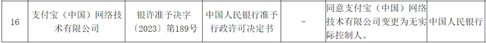 据央行网站2023年12月29日公示的非银行支付机构重大事项变更许可信息,同意支付宝(中国)网络技术有限公司变更为无实际控制人。