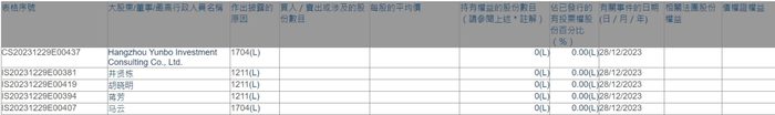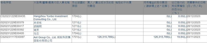 根据香港联交所权益资料近期披露的信息,马云及其在蚂蚁集团的另三名一致行动人井贤栋、胡晓明、蒋芳于2023年12月28日将各自所在6只港股的权益清零。