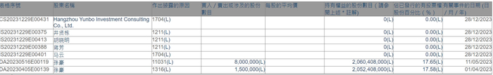 马云等清空6家港股的权益