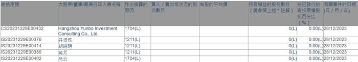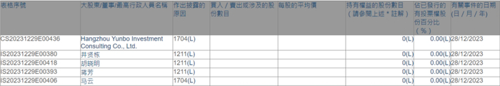 此次清空权益的包括马云、井贤栋、胡晓明、蒋芳,以及杭州云铂投资咨询有限公司(马云、胡晓明、井贤栋、蒋芳四人持股)。