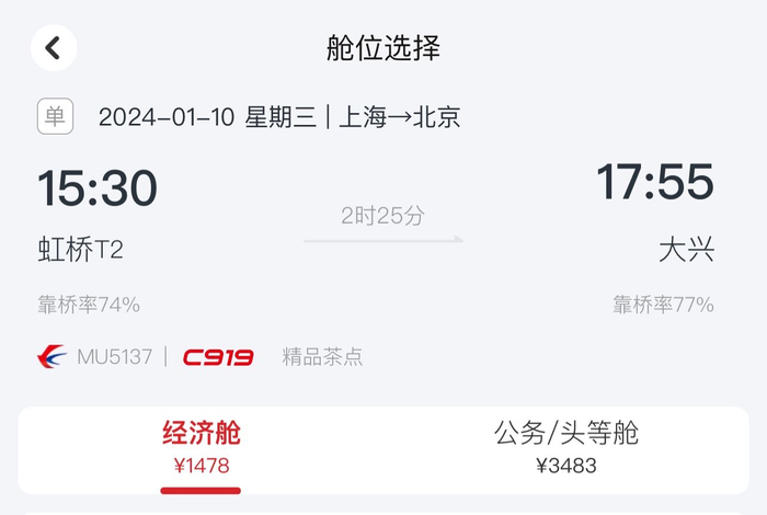 从票价水平来看,以1月10日(明天)为例,东航APP显示, C919执飞的上海虹桥-北京大兴航班经济舱票价最低1478元,公务舱票价最低3483元。而当天东航上海虹桥-北京大兴航班共有7班,C919执飞的那趟票价最高,其余航班票价在530元-1300元之间。