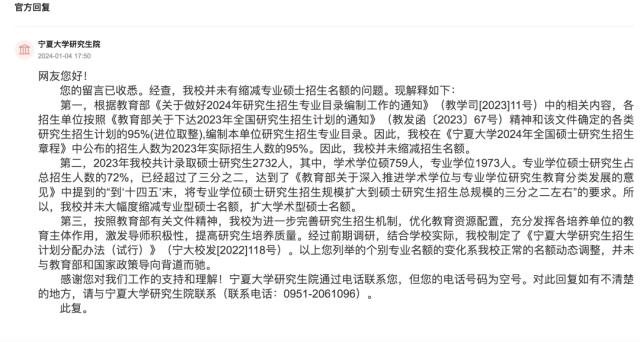 据人民网“领导留言板”消息,针对网友关于宁夏大学“大幅缩减专业硕士招生名额”的投诉,1月4日,宁夏大学研究生院作出回应。