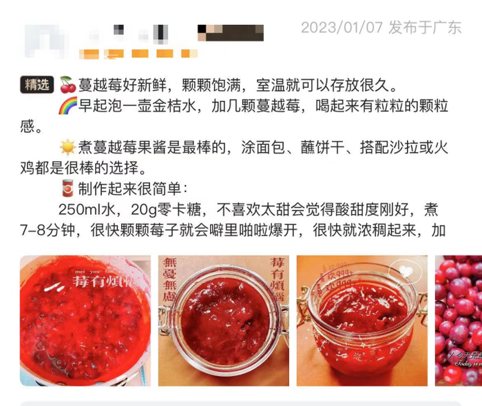 在商品评价区,有网友自制了蔓越莓果酱,用来配酸奶、抹吐司,口味相当友好。还有网友评价,鲜食有些许酸涩感,不爱吃酸的吃货表示有些吃不惯,建议首次购买小盒装尝鲜。除了鲜食,也可以尝试泡水、榨汁、调制鸡尾酒等食用方法。
