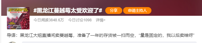 在社交平台上,一位黑龙江大姐在直播间卖蔓越莓,准备了一年的存货被一扫而空,“量是固定的,我以后卖啥呀。”电商平台上的水果商,纷纷感受到网友们的热情。