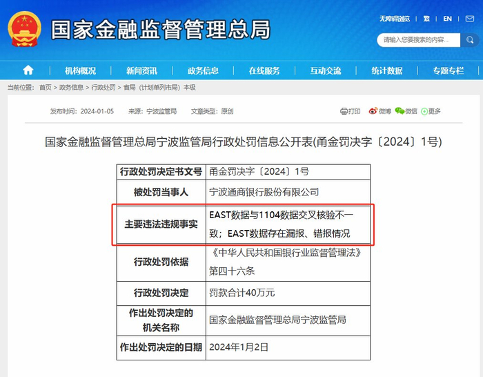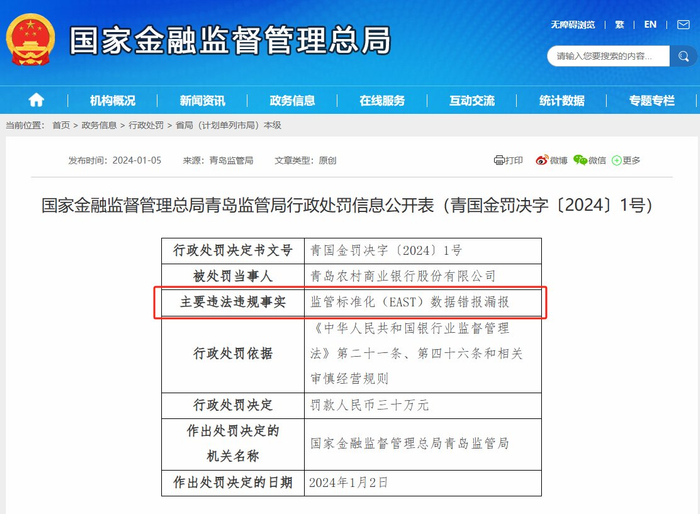 据国家金融监管总局披露,1月5日,青岛农商行因“监管标准化(EAST)数据错报漏报”被青岛监管局处罚30万元;同日,宁波通商银行股份有限公司(简称“宁波通商银行”)因“EAST数据与1104数据交叉核验不一致;EAST数据存在漏报、错报情况”被宁波监管局处罚40万元。