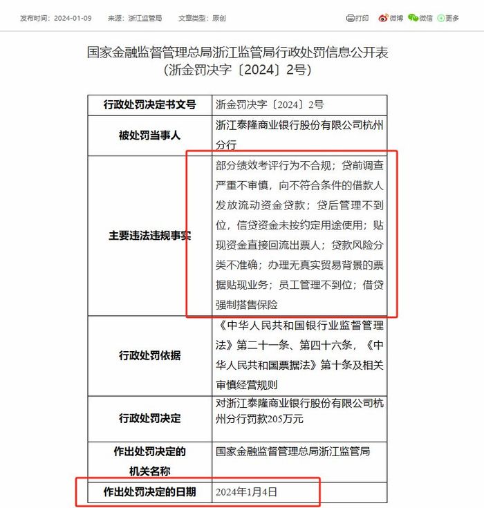 财联社记者注意到,随着各地“1号罚单”的披露,年内银行机构首张百万级别大额罚单也随之出炉。1月9日,国家金融监管总局网站显示,浙江泰隆商业银行股份有限公司(简称“泰隆银行”)杭州分行因“绩效考评不合规”等8项违法违规行为被罚款205万元。