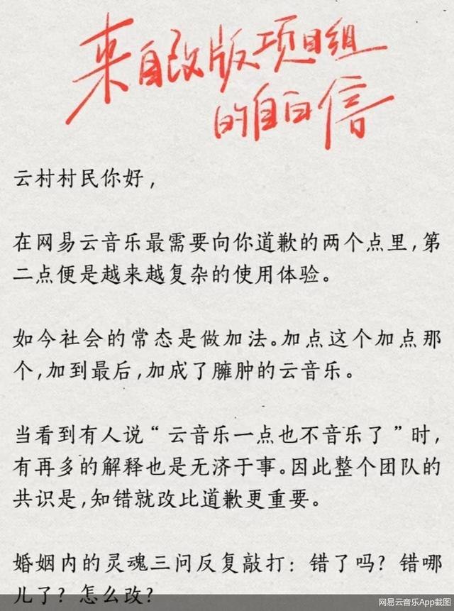 “再多的解释也是无济于事”“知错就改比道歉更重要”,网易云音乐在“来自改版项目组的自白信”中说,这是整个团队的共识,于是网易云音乐决定推动有史以来最大的一次改版。