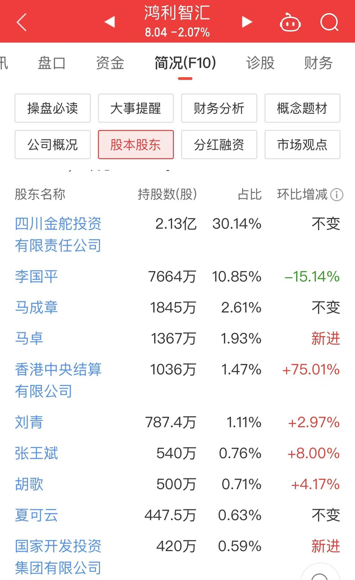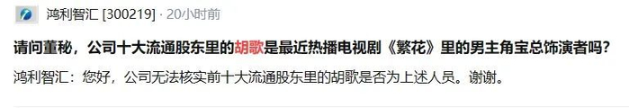 1月8日,鸿利智汇(300219,股价8.04元,市值56.92亿元)在投资者互动平台上回应称,公司无法核实前十大流通股东里的“胡歌”是否为《繁花》里的男主角宝总饰演者。众智科技也在互动平台上表示,公司目前未知该流通股股东(“胡歌”)具体身份,因涉及股东个人隐私且不属于公司信息披露范围,故不便透露。