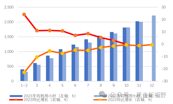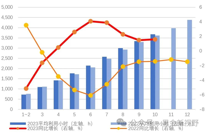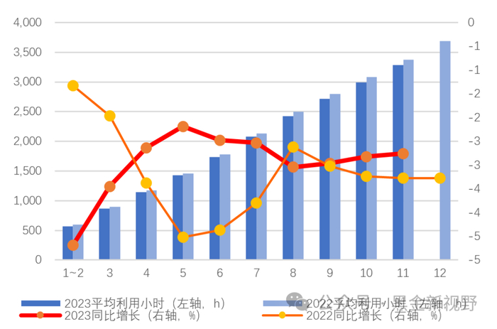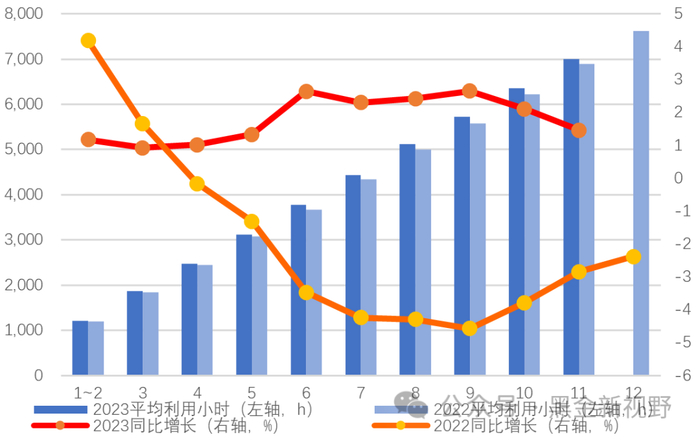 ⚫1-11月全国发电设备平均利用小时数3282小时,同比降低2.76%。其中,火电平均利用小时4040小时,同比上升1.56%;水电平均利用小时数2927小时,同比降低9.01%;核电平均利用小时数7001小时,同比上升1.46%;风电平均利用小时数2029小时,同比上升1.05%;光伏平均利用小时数1218小时,同比下降3.33%。