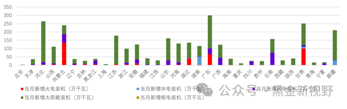 ⚫分地区看,11月新增火电装机排名前三的省份为内蒙古(134万千瓦)、甘肃(100万千瓦)、广东(66万千瓦);新增水电装机排名前三的省份为湖南(50万千瓦)、新疆(30万千瓦)、甘肃(11万千瓦);新增风电装机排名前三的省份为云南(76万千瓦)、内蒙古(54万千瓦)、广西(44万千瓦);新增光伏装机排名前三的省份为河北(247万千瓦)、新疆(178万千瓦)、江苏(172万千瓦)。