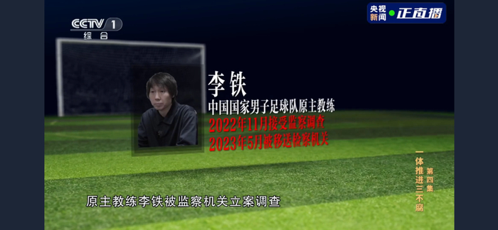 丁进田(中央纪委国家监委驻国家体育总局纪检监察组副组长):作为中央纪委国家监委的派驻机构,我们组立足职责定位,在发现李铁以权谋私的问题以后,我们一方面严肃查处,一方面我们想以此为突破口发现中国足球存在的根本性问题,回答广大球迷“中国男子足球为什么上不去”的疑问,从而推动中国足球健康发展。