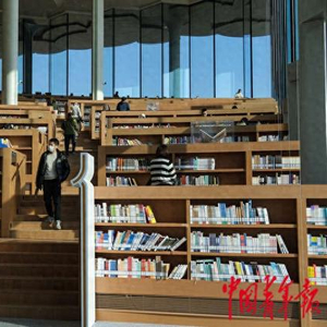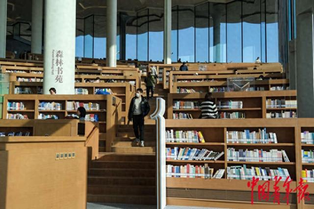 1月9日,北京通州,北京城市图书馆,市民穿梭在“森林书苑”。据了解,该图书馆的设计理念源于中国传统文化符号“赤印”,依据山形而设计的阶梯阅读区视野开阔,坐席充裕,深受市民欢迎。北京城市图书馆总建筑面积约7.5万平方米,分为地上3层、地下1层,藏书能力达800万册,阅览座席约2400个,包括开放阅读区、少年儿童馆、非遗文献馆、古籍文献馆、艺术文献馆以及元宇宙图书馆、24小时图书馆、休闲服务区、文化交流区等服务空间。