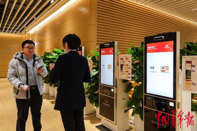 1月9日,北京通州,北京城市图书馆,市民在B1层的自助机前咨询读书卡办理业务。据介绍,市民可携带身份证在自助机快速办理实体读书卡,也可通过“北京城市图书馆”微信小程序自助申请。中青报·中青网记者 张玉佳/摄