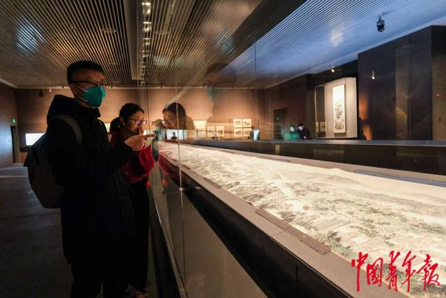 1月9日,北京通州,北京大运河博物馆7号展厅,市民正在观看北京大运河揽胜图。北京大运河博物馆展陈体系由基本陈列、专题展览、开放展示、临时展览四大类型构成。其中,基本陈列“京华通惠 运河永济——北京与大运河历史文化陈列”位于展陈大楼二层的4个展厅,利用雕塑、装置艺术多种展陈方式以及虚拟数字人、全景沉浸式体验等高科技手段,通过近1000件文物、艺术品,以时间为轴,还原大运河发展演变历史,展示了大运河与北京的密切关系以及运河沿线的人文历史。中青报·中青网记者 张玉佳/摄