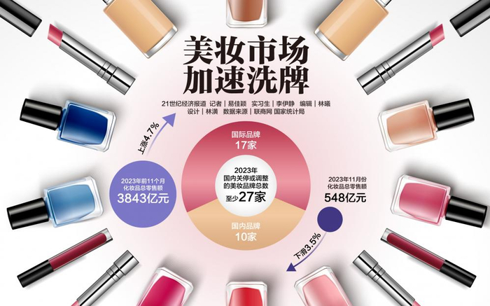 据联商网零售研究中心不完全统计,2023年,国内市场上至少有27个美妆品牌宣布倒闭或调整,其中既包括依泉Uraige、露华浓等进入中国市场超20年的外资美妆,也不乏its focus意珂思、未燃等发展未超过3年的新兴国产品牌。