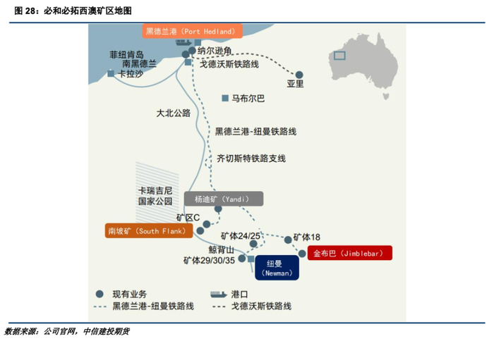 西坡铁矿项目:为填补哈默斯利、荷普山等老牌矿区产量衰减的缺口,并维持其帕拉布杜枢纽的皮尔巴拉混合矿(PB)的产能,2022年9月,力拓与宝武集团建立合营公司,共同投资20亿美元开发西坡铁矿项目(Western Range)。西坡矿资源量为2.32亿吨,铁品位为61.2%。项目于2023年3月启动,仍按计划处于建设过程中,目前已做好土方工程和矿山预处理工作,预计2025年交付首批铁矿石,年产能达2500万吨。