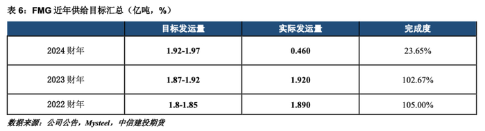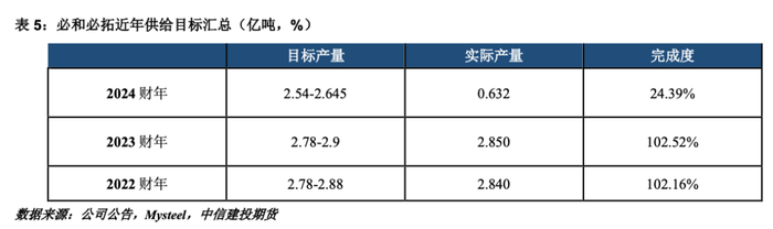4、必和必拓近年产能扩张项目主要为南坡矿,于2021年5月首次生产,目前处于产能爬坡阶段,预计2024年6月全面达产,将新增产能650万吨。在产量目标方面,必和必拓预计产量为2.54-2.645亿吨,按区间中值计算,目前已完成2024财年产量指导目标的24.39%。