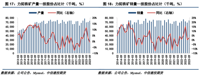 萨马科地区三季度产量稳定增长,销量略有波动,2024财年产量目标不变。三季度,萨马科地区的产量为123万吨,同比增加7.2%,环比增加0.8%;销量为114万吨,同比减少0.9%,环比减少2.1%。产量增加得益于选矿厂吞吐量的提高。2024财年的产量指标目标维持在400-450万吨不变。