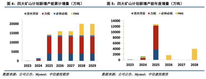 我们预计2023-2029年四大矿山累计新增产能将达到2亿吨,近年四大矿山产能释放主要集中在2025年,当年将有1.28亿吨的新增产能增量。2024年,预计四大矿山将新增产能1500万吨。