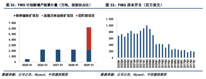 5、FMG近年增产计划为铁桥磁铁矿项目、加莲贝林加铁矿项目以及尼町胡项目。目前铁桥项目已从2023年5月开始投产,2024财年发货量预计为500万吨,预计在2025年8月中旬前达到2200万吨的满负荷产能。FMG的发货量目标为1.92-1.97亿吨,其中500万吨来源于铁桥项目。