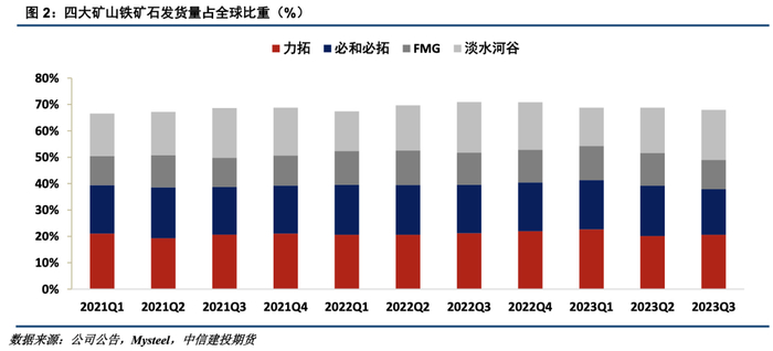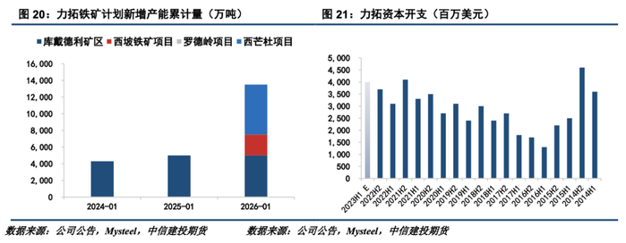 3、力拓积极拓展产能计划,目前正在开发库戴德利矿区、西坡铁矿项目、罗德岭项目以及西芒杜项目。除库戴德利矿区将于2024年增加700万吨产能外,其余项目均在2025年陆续释放产能,共计12500万吨。在发运指导计划方面,其中力拓的年发运量预计将保持在3.2-3.35亿吨的高位。