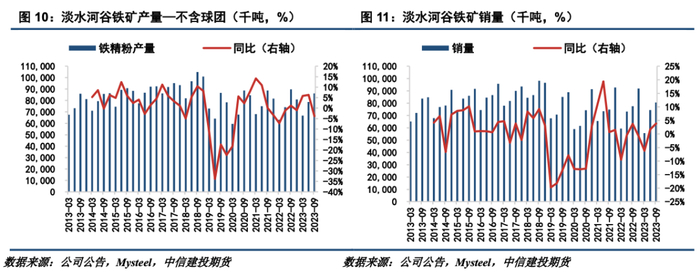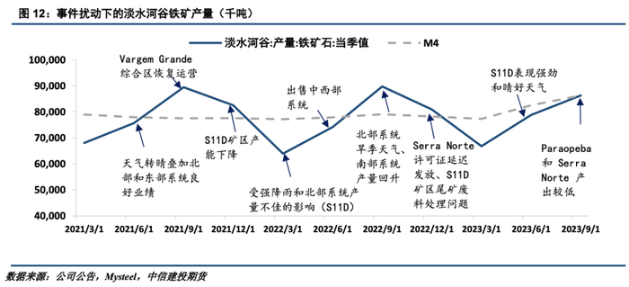2、淡水河谷近年增产计划有New Steel Project、S11D矿区土建工程、北部系统产能扩张项目以及卡帕内玛项目。除New Steel Project已于2022 年下半年投产、北部系统产能扩张项目投产时间未定外,其余项目将于2025年投产,预计释放产能3800万吨。淡水河谷维持其3.1-3.2亿吨的铁矿石产量目标,预计其全年将达成产量指导目标的中间位置。