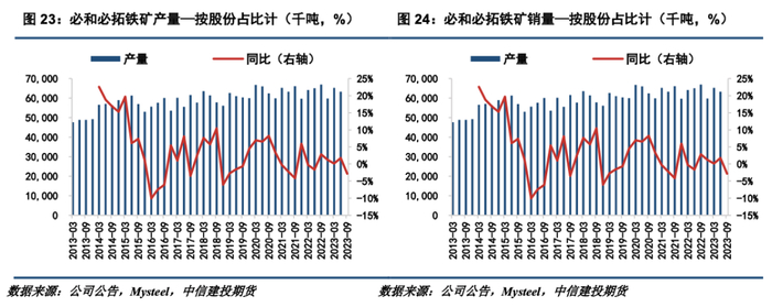 必和必拓三季度产降销增,维持2024财年指导目标不变。必和必拓三季度铁矿石产量6324万吨(按股份占比计),同比下跌2.8%,环比下跌3.2%;三季度销量6532万吨,同比上涨3.0%,环比上涨1.9%。2024财年产量指导目标维持2.54-2.645亿吨不变,按区间中值计算,目前已完成2024财年产量指导目标的24.39%。