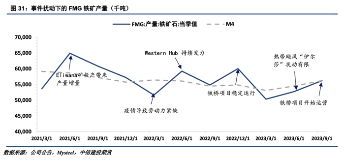 近三年来,虽受多种因素扰动,四大矿山铁矿石供给整体呈现恢复趋势。2021年,在全球供应链未完全复苏的环境中,力拓和必和必拓面临劳动力短缺等多重因素的影响,产销均有小幅下滑,相比之下,淡水河谷与FMG则表现出较强的产销态势。2022年,随着西澳疫情逐渐褪去,澳矿产销态势良好,然而淡水河谷却因强降雨天气等因素扰动未能达成目标。2023年,尽管受到四月中旬的澳洲飓风和雨季,以及主流矿山安全事故、项目检修维护的影响,四大矿山的发运总体表现在市场需求改善的背景下呈现出相对强劲的趋势。