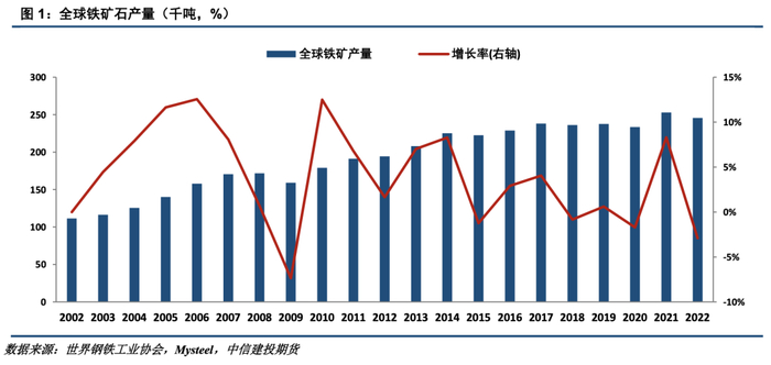 据世界钢铁工业协会,近二十年全球铁矿石产量总体呈增长趋势,由11.1亿吨增长至24.6亿吨。从产量增长率的变化趋势来看,全球铁矿石供给呈现出3-5年的小周期变化趋势。自2020年进入本轮周期之后,全球铁矿石供应已经经历了2021年矿山项目产能释放、2022年受中国需求减缓及疫情冲击影响转落、2023年全球需求回暖叠加高矿价驱动供给回升的过程。展望2024年,随着多个新矿山项目产能投产以及一些现有矿山项目的产能释放,全球铁矿产量有望进一步提升。