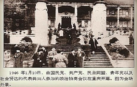 1946年1月10日,“旧政协会议”在重庆召开。参加者有国民党代表8人,共产党代表7人,民主同盟代表9人,青年党代表5人,无党派人士9人,共38人。这次会议经过激烈的斗争,终于通过和平建国纲领、关于军事问题的协议、关于国民大会的协议、关于宪法草案问题的协议、关于改组政府的协议等五项协议。这些协议案在不同程度上否定了国民党的独裁统治和内战政策,是有利于人民的。