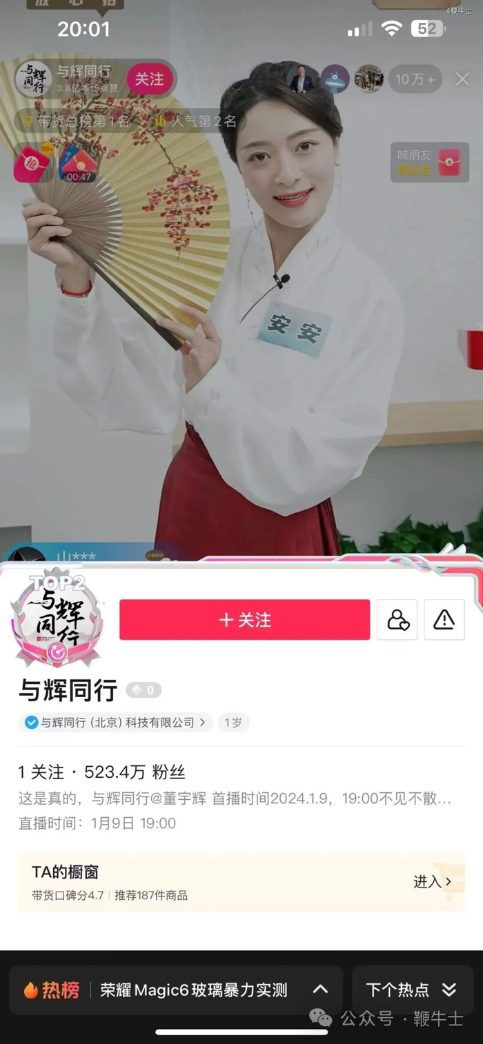 1月9日消息,晚间19时00分,董宇辉抖音独立账号「与辉同行」正式首播,开播不到半分钟观看人数高达10万+,人气榜和小时榜双榜全平台*。
