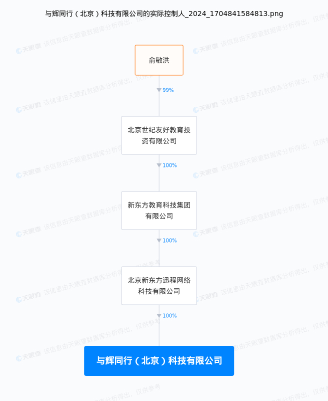 据天眼查APP显示,与辉同行(北京)科技有限公司注册资本1000万元,董宇辉为法定代表人、执行董事、经理,俞敏洪担任监事。股权穿透显示,由孙东旭担任法定代表人的新东方迅程网络科技100%控股与辉同行,与辉同行(北京)科技有限公司实控人依然为俞敏洪。