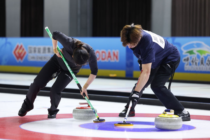 1月9日,黑龙江组合李思霖/文馨悦(左)在混双第一轮比赛中擦冰。最终,他们6:5战胜贵州组合赵泽源/谭斯婷。新华社记者 王楷焱 摄