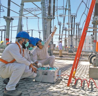 在巴基斯坦默蒂亚里—拉合尔直流输电项目现场,中巴工程师对设备开展日常检修。