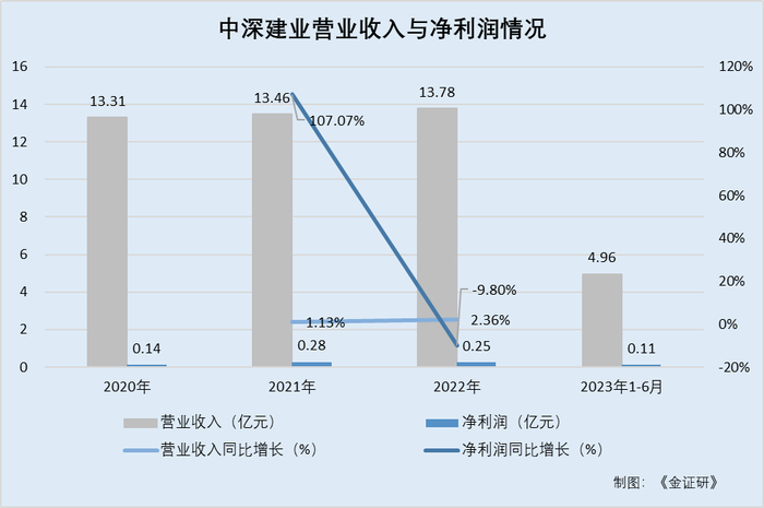 据签署于2023年9月30日的招股书,2020-2022年及2023年1-6月,中深建业的营业收入分别为13.31亿元、13.46亿元、13.78亿元、4.96亿元,2021-2022年分别同比增长1.13%、2.36%。