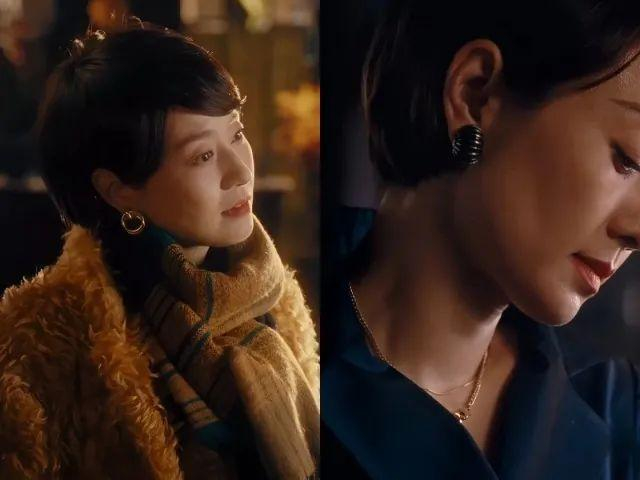 剧中的汪小姐,是体制内的职工,服装以套裙、西装为主,还有一头大波浪卷发。配饰上点缀了一些黄金、珍珠配饰,但佩戴的数量严格把控,全身上下只有一件首饰,专业又优雅。
