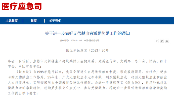 近日,国家卫生健康委、中央宣传部、全国总工会等六部门联合发布《关于进一步做好无偿献血者激励奖励工作的通知》(以下简称《通知》),要求各地有关单位提高无偿献血者的荣誉感和获得感,激励更多社会公众关心、参与无偿献血。
