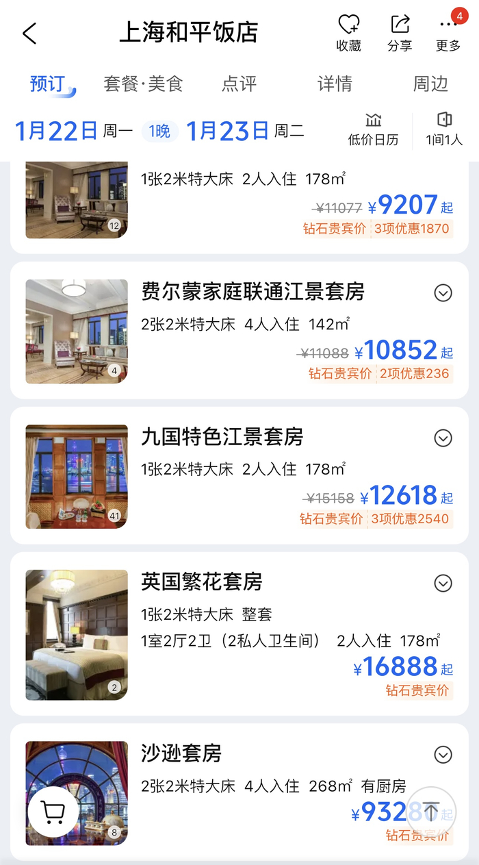 此外,上海和平饭店最贵套房“沙逊套房”平日预订价格为93280元/晚,1月11日晚入住的房间已被预订;周末为93820元/晚,除夕、情人节的价格为116600元/晚,目前仍可预订。