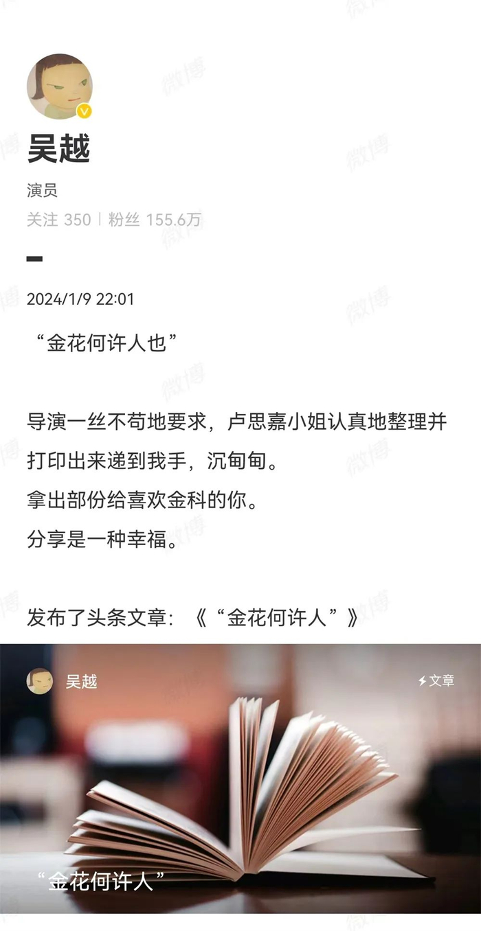 演金花的吴越,当晚以长文发出了金花的部分人物小传“金花何许人”,果然如她早前出席活动时所说,内容事无巨细,包括个人习惯,工作作息,家世爱情……吴越写道:“拿出部分给喜欢金科的你。分享是一种幸福。”