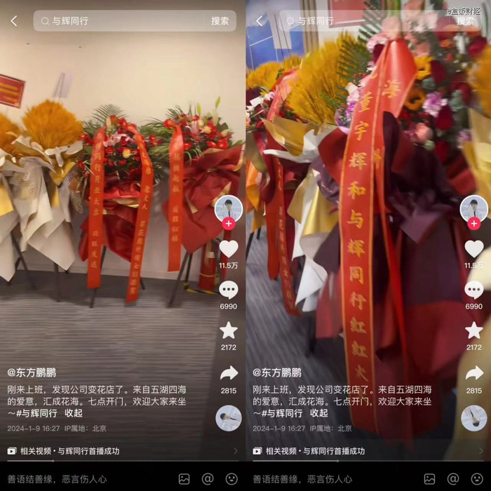 1月9日中午,源源不断的花篮被送入中关村大街11号的e世界大厦,这里是东方甄选总部所在地,也是董宇辉新账号与辉同行当晚的直播所在地。