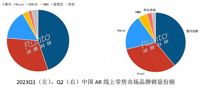 2023年第一季度,在AR(增强显示)设备细分市场中,雷鸟和Nreal分别排在线上主要零售渠道销量的第一和第二,2023年第一季度合计份额超过了70%。雷鸟、Nreal、Rokid的市场份额分别为44.8%、31.5%、15.4%。