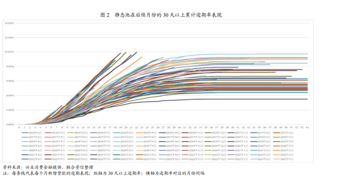 但是,未表现完的部分,风险明显比之前高很多,只要对每一期的风险进行一个大概比对,就会发现兴业消金去年年初的逾期表现,较此前最高点涨了60%左右。