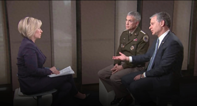 美国联邦调查局(FBI)局长克里斯托弗•雷和美国国家安全局局长、网络司令部司令保罗•中曾根9日接受CNBC采访 视频截图 来源:CNBC